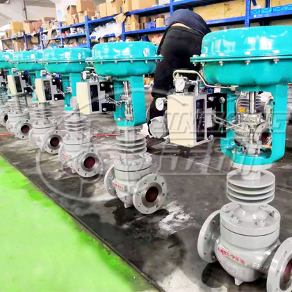 溫控型調節閥的結構與原理,工作前主閥芯處于半開位置,傳感器處于自然狀態。接上電源,主閥芯全開。介質由箭頭方向流入主閥體經閥芯對儲熱箱進行加熱。當溫度升到相應設定值時,傳感器即產生相應線性信號輸入至溫控調節儀,溫控調節儀通過比較傳感器溫度信號及用戶設定溫度比較,進行PID運算,輸出4~20mA電信號至電-氣定位器,定位器調節信號驅動氣動執行器,驅動閥桿、閿芯產生位移,關閉主閥芯。通過閉環控制,進行連續調節來控制閥后溫度至設定值,冷卻型反之,并可根據使用現場系統設備的不同靈活調整比例帶,積分時間等參數,使之與系統達到zui佳匹配,溫差比例小,反應靈敏,使用壽命高。![]()